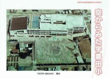 昭和58年4月1日に開校した当時の宇喜田小学校の写真です。今は、使用していない南門から西門の脇まで道路がありました。