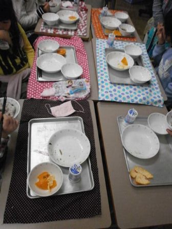 開校記念日給食を残さず食べている、1年生の食事風景です。