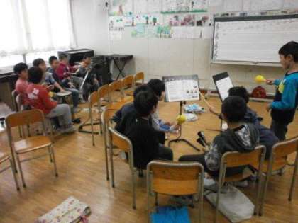 サンバの前に『たきび』を歌いました。発声練習もしっかりと終え、とても美しい声を聞くことが出来ました。さあ、サンバの練習です。グループごとに分かれ一斉に練習が始まりました。グループ内の話あいが過熱しているところもありましたが、さすが4年生、音のパワーは桁外れでした。