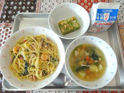 宇喜田小には35束、kg数にすると17.5kgもの小松菜が届けられ、今年はそれをスパゲッティとスープ、デザートの洋食のメニューに活用しました。どれも骨や歯を強く丈夫にするカルシウムや、健康な血液をつくるのに欠かせない鉄分など、栄養たっぷりな小松菜の色や食感を活かした料理です。