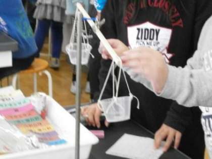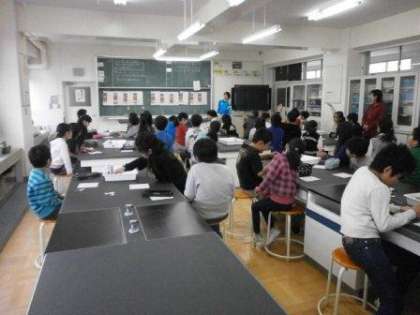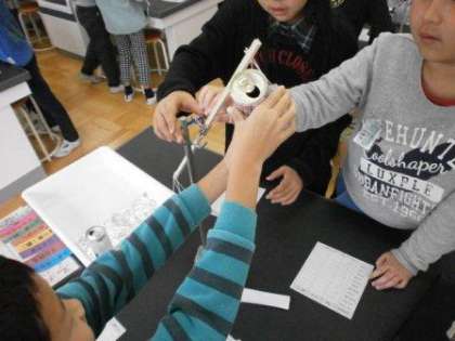 理科室に行きました。3年生の理科の授業です。理科室は、実験の真っ最中でした。興味を持つ児童の熱き視線は、実験道具にくぎ付けです。この道具、先生方の手作り作品です。