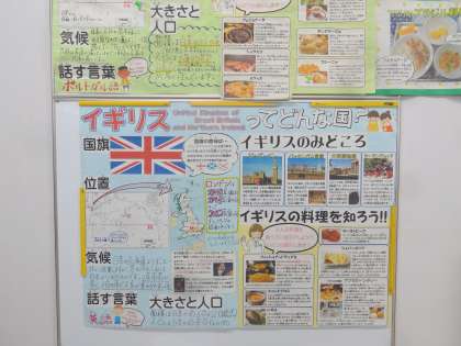 遅くなってしまいましたが、今月も栄養黒板の隣に、イギリスについて紹介した掲示物を貼り出しました!ぜひたくさんの子供たちに見てもらいたいです。