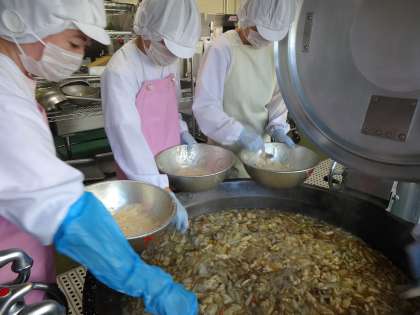 給食で作るすいとんは、野菜もお肉もたくさん入った、とても栄養のあるすいとんです。