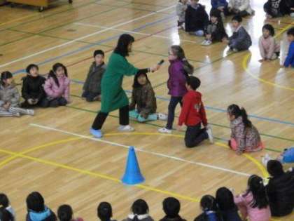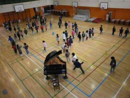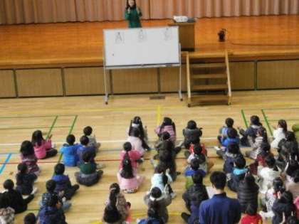 5時間目、体育館で1年生全員が音楽の授業を行いました。寒さを吹き飛ばす『音でよびかけっこ』の授業です。組曲『くるみ割り人形』より『行進曲』(チャイコフスキー作曲)が流れます。楽器による呼びかけ合いの面白さを感じ取りながら聴いたり、リズムでかけ合いをしたりして楽しんでいました。