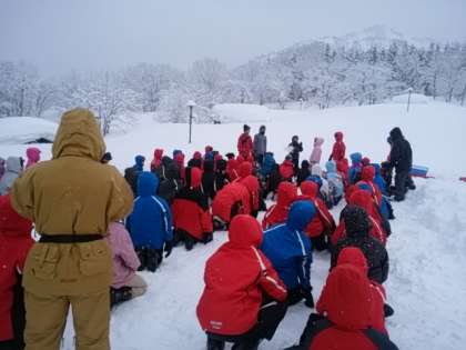 雪上運動会がはじまりました。雪はやんだようです。各クラス力を合わせて挑みます。