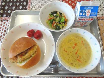 今日は来年新1年生になる、船堀幼稚園の園児のみなさんが、宇喜田小を訪れました。そして3年生のみなさんが、お兄さんお姉さんとして、宇喜田小を紹介したり、一緒に楽しくお話しながら給食をいただく「ふれあい給食会」を開いてくれました。今日の給食は、そんな「ふれあい給食会」で幼稚園のみなさんが食べやすいようなメニューを考えました。