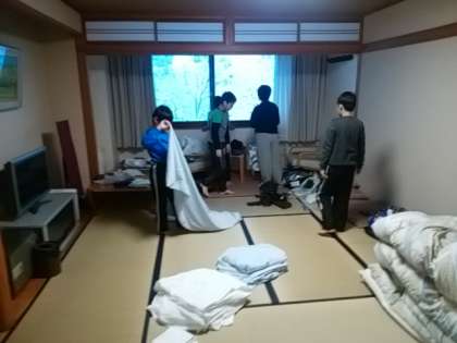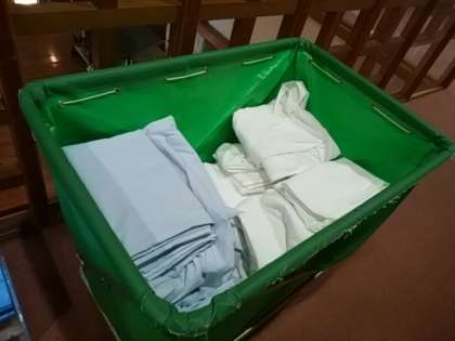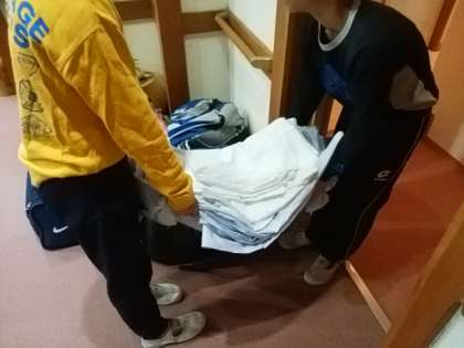 シーツ、掛け布団カバー、枕カバーをたたみ、運びます。さて、きれいに片付けることが出来たでしょうか。