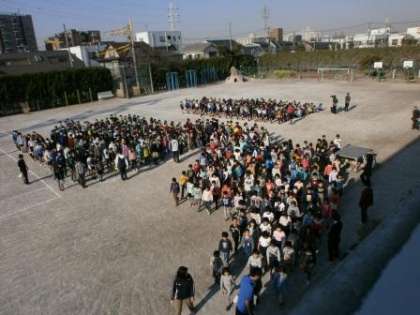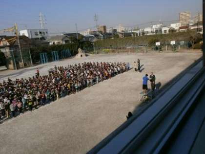 目の前にいる宇喜田小学校の全校児童は、とても良い姿勢で整列しています。朝礼台に立つと心が引き締まる思いです。