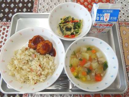 今日の給食を見て「先生、これなんですか?」とナゲットを指差す子たちに「ナゲットだよ〜」と話すと、「あ、ほんとだ!!ナゲットだ!」という反応から、やはり子供たちにも親しみのある料理なんだなという印象を受けました。1人2個付でしたが、調理員さんが1つ1つ丁寧に、かわいく丸めてくれました。