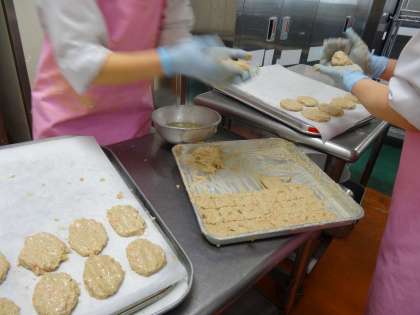 * じゃこてん(←写真はじゃこてんを小判形に成形しているところです)