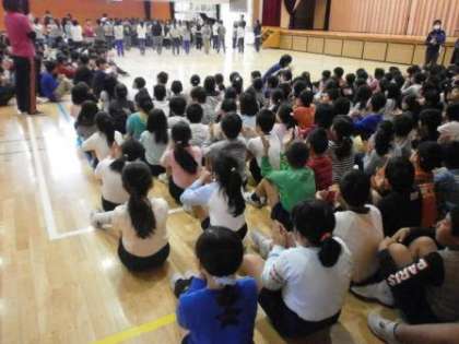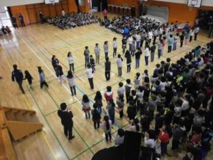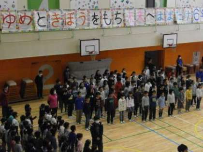 体育館に移動すると、いつもと雰囲気が違います。そうです、6年生がいません。今朝は、1から5年生が体育館に集まり、6年生を送る会のリハーサルを行いました。