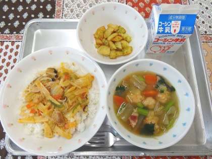 今日は大人(そして辛いもの好き)の私でも、上掛けだけで味見をしたら「あれ、ちょっとからめ…」と感じる仕上がりだったので「(特に)低学年は食べられるかしら?!」と少し不安でした。ですが給食時間、低学年のクラスを回ると、その不安をよそにみんなパクパクよく食べてくれていました。