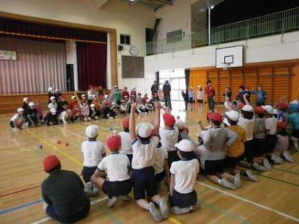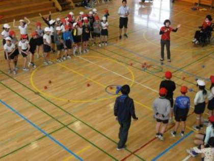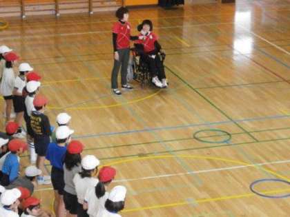 私は、どんなに優しく投げたり強く投げたりしても輪に入らなかったのに秋元先生が試合のお手本をした時、一発で白いボールに当てられたので、私は目が飛びそうなくらい驚き『すごい』とたくさん言いました。これからも体が不自由な人を助けてあげたりしたいです。私は、秋元先生と渡辺先生が一緒に練習しているところが頭に浮かびました。また、宇喜田小に是非来て下さい。
