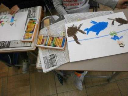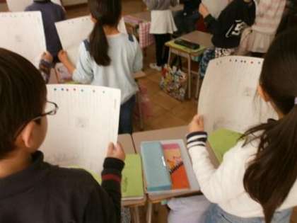 ぴかぴかの1年生から1年が過ぎようとしています。1年生の成長を確認しに1階へと出かけました。国語と図工の授業に取り組んでいました。