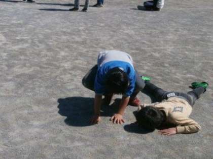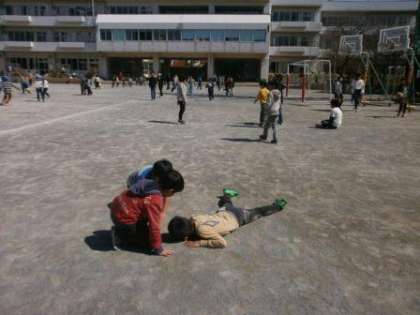 再び校庭にカメラを向けると、児童が一人倒れています。お友達が駆け寄りました。大丈夫かなと覗き込むと、服も顔も砂だらけ、そして笑い声…。大地の息吹を感じ取っていたのでしょうか。すぐに、遊びが始まりました。