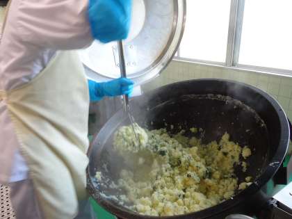 今日、給食室では、朝から大量のじゃがいもを茹でて、ていねいにつぶして、とっても熱い中片栗粉を混ぜ込み、1つ1つ丸く形作って油で揚げました。