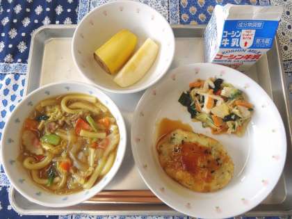 1年生もはじめての味の数々に、箸を進めるたび「このじゃがいものおもち、とってもおいしい!はじめにちょっとへらしちゃったけど、あとでおかわりします」「カレーうどんだいすき!!おいしい!!」などと、笑顔で話してくれました。1年生、給食が始まってまだ数日ですが、初日と比べると、配膳や食べ方など、毎日大きく進歩しているのが分かります。食べる量としては、まだまだ1年生に本来必要な量に到達しない子も多くみられますが、成長とともに少しずつ、食べられる量が増えてくるといいなと思います。