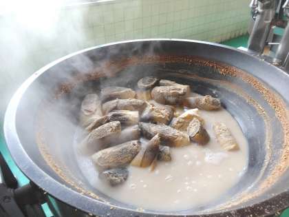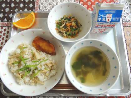 今日の給食の「しんたけのこごはん」は、たけのこと油揚げをやさしい味に味付けしたものを、たきあがったご飯に混ぜ込みました(ご飯の炊飯時には、具の煮汁を入れて炊いています)。また「わかたけじる」にも、たけのこの一部分を使いました。