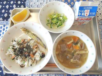 今日の給食の「ししゃものいそべあげ」は、ししゃもに、青のりを入れた衣をまとわせ、油でサクッと揚げたものです。