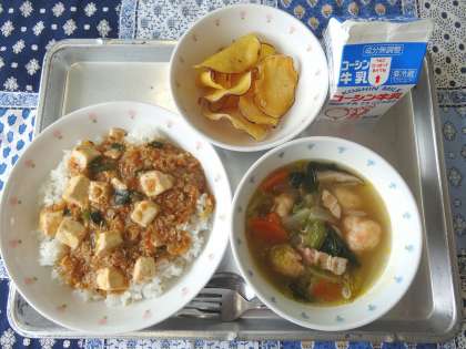 今日の給食の「マーボ—どん」は、麻婆豆腐を白いごはんにたっぷりかけていただきます!麻婆豆腐というと、唐辛子がたっぷりで「辛い料理」というイメージが強いですよね。給食でも小学生向けにアレンジしつつも、本格的な味を目標に、豆板醤(トウバンジャン)という辛い味噌やラー油を使って、少しピリ辛に仕上げています。