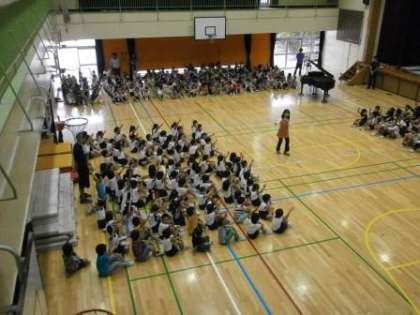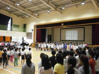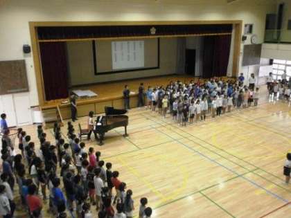 水曜日の朝は音楽朝会。全校で「おおきなうた」を歌いました。この歌は輪唱になります。低学年と高学年で分けたり、1、3、5年と2、4、6年で分けたりして輪唱を楽しみました。途中と最後に自己評価。「グー、チョキ、パー」で振り返ります。とても気持ちの良い歌声が体育館中に響きました。