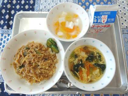 今日の給食の「タンタンどん」は、ひき肉や短くカットした春雨を、同じように練りごまや味噌などで、担々麺風の味に仕上げたあんをごはんにかけていただきます。