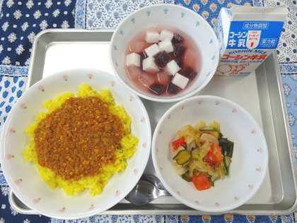 今日の給食はみんな大好き!カレーライスです。今月は「ドライカレー」というカレーで、ドライとは英語で「水分のない」という意味です。ルゥを使うタイプのカレーとは違って、水分の少ないカレーです。ごはんは、ターメリックという黄色の香辛料を入れて炊きました。