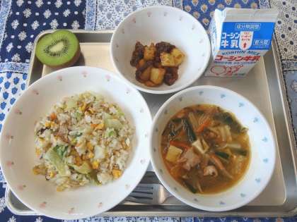 今日の給食の「レタスチャーハン」は、具だくさんのチャーハンに、最後にレタスを加えて混ぜ合わせたチャーハンです。