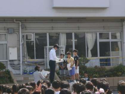 朝会は、表彰から始まりました。
