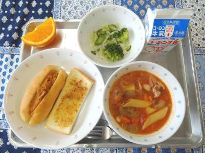 今日の給食の「アーモンドトースト」は、粗めに刻んだアーモンドと、粉にしたアーモンドの2種類のアーモンドを混ぜたマーガリンを、食パンに塗って焼いたものです。ざくざくとした食感と、甘くて香ばしい香りがポイントです。