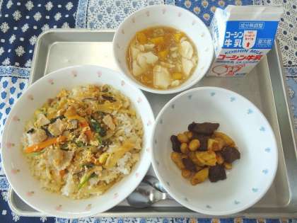 今日の給食の「キムチクッパ」、韓国語で「クッ」はスープ、「パ」はごはんのことで、ごはんの上に肉や野菜などを煮込んだ熱いスープをかけて食べる韓国料理です。日本のお茶漬けや雑炊のような感じでしょうか。お皿にごはんをよそい、上からピリ辛のキムチスープをかけていただきます。