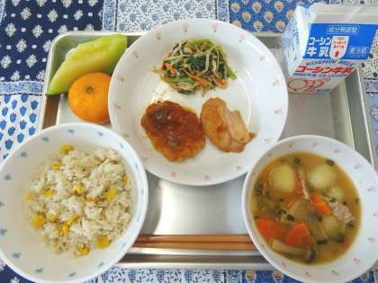 給食時間、各クラスを回って様子を見ていると、それぞれ方法は違うものの、1人1人が自分の選択したおかずとデザートを、しっかりと配膳できていました。みなさんおいしそうに自分の選んだ方を食べていましたが、てりやきチキンを選んだ子たちの中に「ごまバーグおいしそう…おかわりないですか?」「ごまバーグにすればよかった…」という声が多かったのが印象的でした(笑)