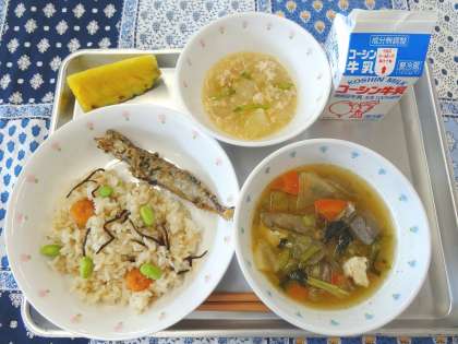 今日の給食の「えだまめとこんぶのごはん」は、八百屋さんがさや付きのまま届けてくれた枝豆を給食室でさやからはずし、塩茹でしたものを使いました。