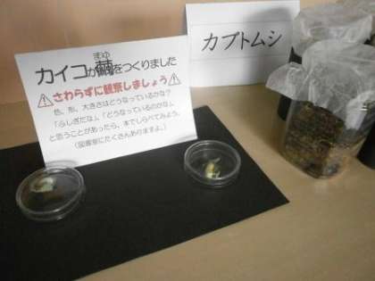 3年生は、この授業の前までに様々な昆虫を育てたり、観察したりしてきました。そしてなんといっても目玉であった「うきうき昆虫園」は3年生だけでなく他の学年の子供たちも立ち止まり、昆虫の様子を見ていきます。モンシロチョウから始まった展示は、ギンヤンマが残り2匹の羽化を待ち、カイコのさなぎ(まゆ)、カブトムシが幼虫からさなぎとなっています。そろそろ土の中からカブトムシが出てきそうです。