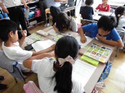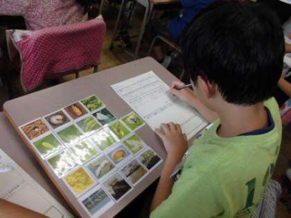 さて、授業では、「昆虫成長カード」という3年生の先生方が作ったカードを一人1セット配り、たまごから成虫までを並び替える活動がありました。子供たちは、これまでのことを思い出しながら、楽しそうに並べていました。