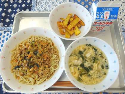 今日の給食の「ひやしタンタンめん」と「キャンディポテト」は、宇喜田小初登場のメニューです!