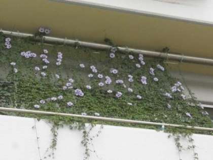 校庭から校舎を見ると3年生のベランダに緑色のカーテンが付いています。よくみると紫色の花が点々と見えます。あさがおです。3年生は総合の学習で「グリーンカーテンプロジェクト」に取り組んでいます。昨年度までゴーヤとヘチマでカーテンをつくっていましたが、今年は朝顔でチャレンジです。地球温暖化防止に向けて、エコな生活について3年生は1学期に考えました。2学期はグリーンカーテンによってエアコンを使わなかったり、温度設定をあげたりしてエコな生活に取り組みます。