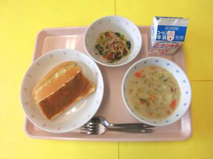 今日の給食の「はるキャベツのクラムチャウダー」は、キャベツをたっぷり使ったあさりのクラムチャウダーです。