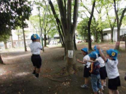校帽をかぶった1年生も校庭やうきたの森で元気いっぱいに遊んでいます。友達と遊んだり、お兄さんやお姉さんと遊ぶ姿も多く見られました。