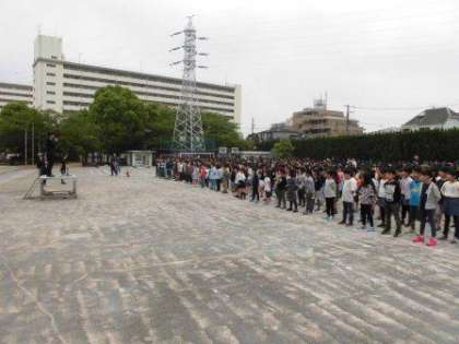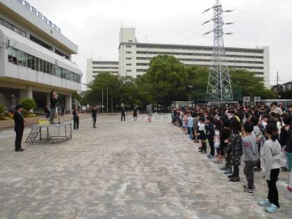 今朝は、校庭での全校朝会。1年生は校庭での全校朝会が初めてです。担任と専科の先生に導かれて、整列することができました。