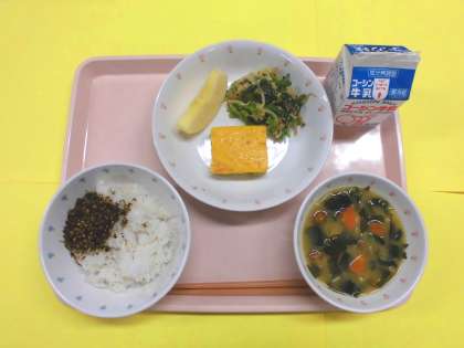 今日の給食のふりかけは、ちりめんじゃことかつおぶしの粉、青のり、ごまで作りました。カルシウムがたっぷりの、栄養も、味も、両方そろった宇喜田小特製のふりかけです!子供たちも「ふりかけだ!」「大盛りで食べたい!」と大喜び!ご飯をモリモリ食べてくれました。