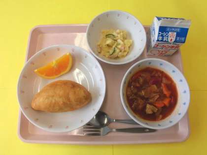 今日の給食は、ロシアでよく食べられている料理を取り入れた、「ロシア料理給食」です。