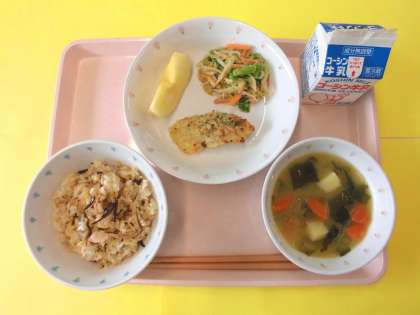 今日の給食の「たらのさざれやき」、「さざれ」とは「小さい」「細かい」という意味です。実は、意外と身近なところでこの言葉は使われています。それは、入学式や卒業式で歌う「君が代」。歌の中の「♪さざれいしの いわおとなりて」という歌詞は、「小さな石がやがて大きな岩となるように」という意味があります。