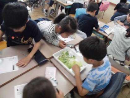 11日(金)、モンシロチョウの観察をしました。虫眼鏡を上手に使い、幼虫やさなぎをしっかり観察していました。
