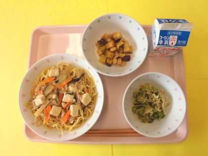 今日の給食の「しせんふうやきそば」は、その名の通り、四川料理風に仕上げたやきそばです。