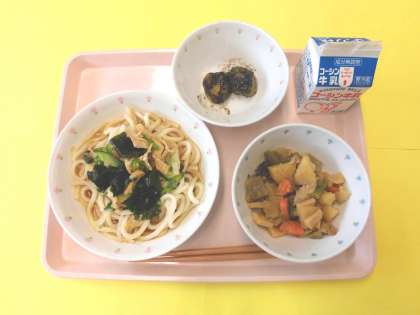 今日の給食の「ひやしきつねうどん」は、お皿にうどんを盛り、その上に油あげなどの具をのせ、最後に冷たいおつゆをかけていただきます。