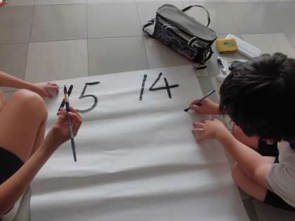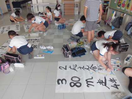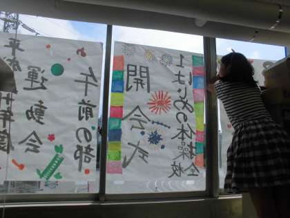 また、運動会本番に校舎の窓ガラスに貼ってある、プログラム。あれもプラカード係が準備したものです。プログラムが見えやすいように濃く、はっきりと文字を書き、装飾も行いました。本番では掲示してあるプログラム、全校の先頭に立つプラカード係の姿に注目してください!!