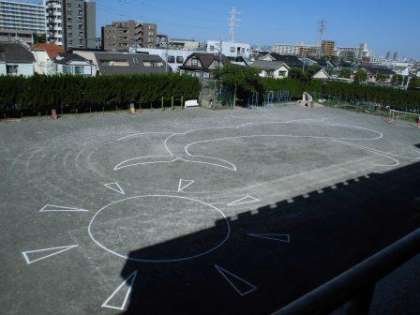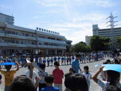 6月1日、音楽朝会後、教務主任の指示のもと、子供たちが順番に校庭に出てきて自分の場所に並びます。