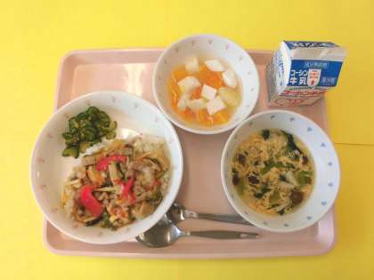 今日の給食では、細く切った豚肉と野菜を炒めて、醤油やオイスターソース、ごま油で味付けをしました。ご飯に合う味付けに仕上がったので、子供たちもよく食べてくれていました!