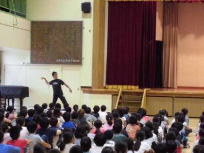 月曜日の朝会では、体育主任の説明で、ソフトボール投げの投げ方について話がありました。なんと主事さんが投げ方の手本を見せ、ポイントをつかませていきました。